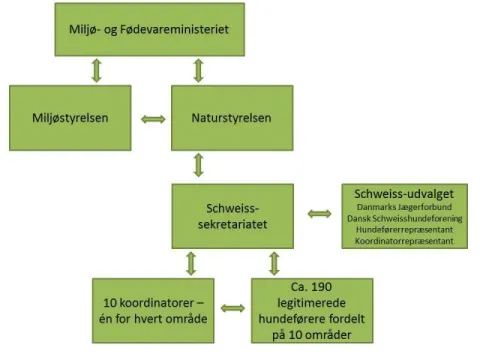 Schweiss-registret udspringer af jagtlovgivningen, og hører derfor til i Miljøstyrelsen, der er statslig myndighed for jagt- og vildtforvaltning. Det er således Miljøstyrelsen, der er ansvarlig for Schweiss-registret og stiller økonomiske ressourcer til rådighed for Schweiss-registret. Naturstyrelsen varetager, efter aftale med Miljøstyrelsen, opgaven med Schweiss-registret.
