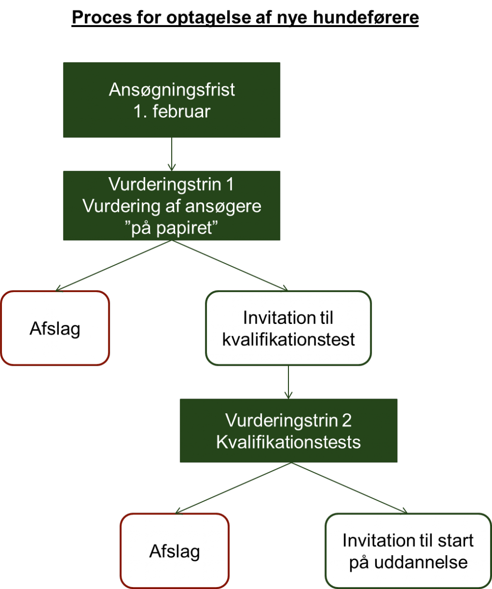 Det vil sige, at hvis ansøgningsfristen er den 1. februar 2021, skal ansøgeren sammen med sin hund have opnået en 1. præmie på en af de ovennævnte prøver i perioden 1. februar 2020 til 1. februar 2021.